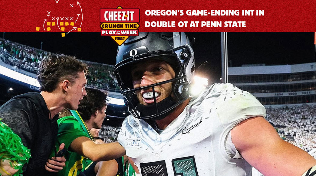 DALLAS (FWAA) – Oregon is the winner of the Cheez-It Crunch Time Play of the Week for Week 5 as safety Dillon Thieneman ended a 30-24 overtime win at Penn State with a leaping interception, as selected by the All-America Commitee of the Football Writers Association of America.