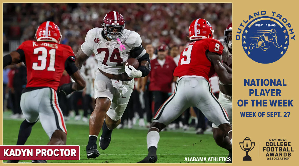 The weekly winners are added to the preseason Outland Trophy watch list going forward. Proctor is already on the watch list. Alabama has a rich history with the Outland Trophy with six previous winners, the most recent being offensive tackle Alex Leatherwood in 2002. Five of the six winners have been offensive tackles.