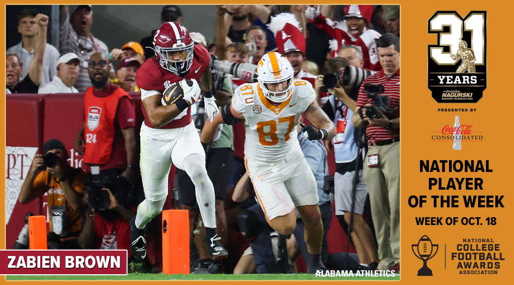 DALLAS (FWAA) – Alabama cornerback Zabien Brown produced one of the highlight plays of this past weekend’s games, intercepting a Tennessee pass intended for the Crimson Tide end zone and taking it back 99 yards for a touchdown, a back-breaking pick-six in the final moments of the first half in its 37-20 win over the Vols. That play, plus his pass coverage that allowed only 16 yards, earned Brown the Bronko Nagurski National Defensive Player of the Week for the weekend of Oct. 18 by the Football Writers Association of America.