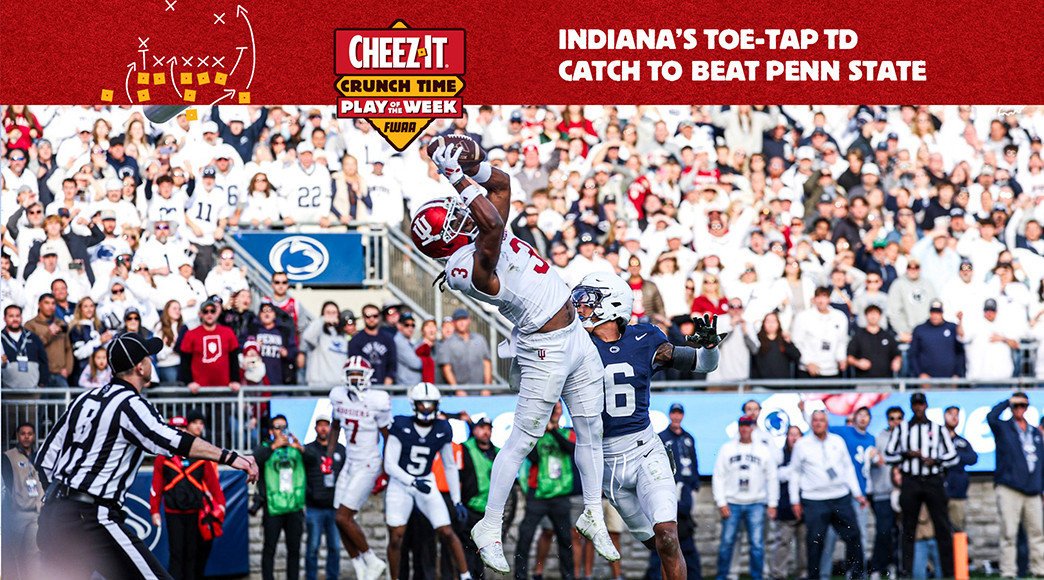 DALLAS (FWAA) – Indiana is the winner of the Cheez-It Crunch Time Play of the Week for Week 11 for Omar Cooper Jr.'s remarkable touchdown catch in the back of the Penn State end zone that kept the Hoosiers unbeaten, as selected by the All-America Commitee of the Football Writers Association of America.