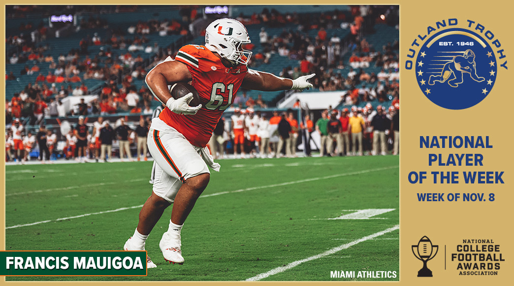 DALLAS (FWAA) – Miami averaged 6.8 yards per play while rolling up 385 yards of total offense Saturday led by an offensive line featuring Francis Mauigoa. In their 38-10 win over Syracuse, the Hurricanes' right tackle controlled his side of the line and even scored a rare touchdown as Miami cruised to the win. For his work Mauigoa earned the Outland Trophy National Player of the Week honor for games during the weekend of Nov. 8, as selected by the Football Writers Association of America.
