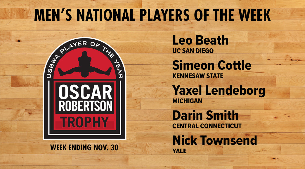 • Week ending Nov. 30: Leo Beath, UC San Diego; Simeon Cottle, Kennesaw State; Yaxel Lendeborg, Michigan; Darin Smith, Central Connecticut; Nick Townsend, Yale.