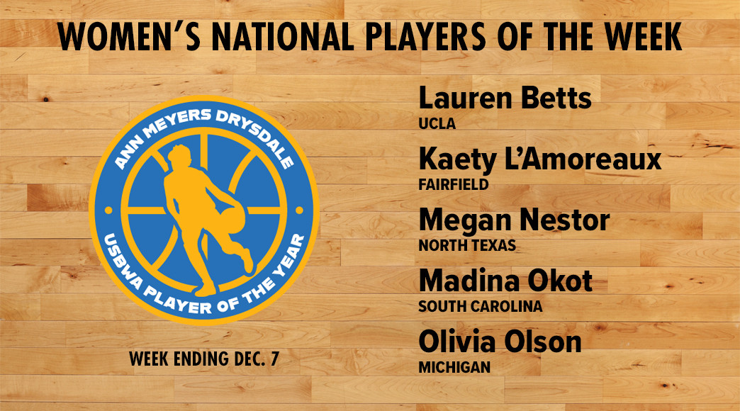 For the period through Sunday, Dec. 7, the five Ann Meyers Drysdale national women’s honorees of the week are UCLA center Lauren Betts; Fairfield guard Kaety L’Amoreaux; North Texas forward Megan Nestor; South Carolina center Madina Okot; Michigan guard Olivia Olson.