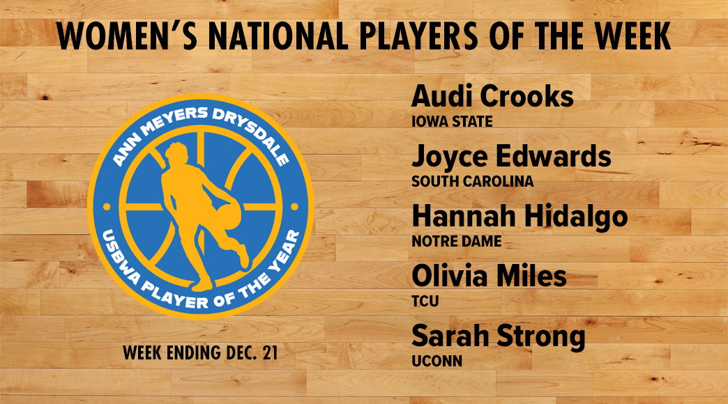 • Week ending Dec. 21: Audi Crooks, Iowa State; Joyce Edwards, South Carolina; Hannah Hidalgo, Notre Dame; Olivia Miles, TCU, Sarah Strong, UConn (National); Lauren Whittaker, Gonzaga (Freshman); Texas Tech (Team).