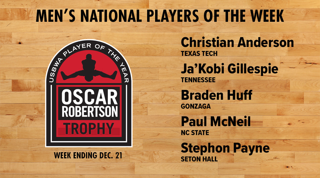 • Week ending Dec. 21: Christian Anderson, Texas Tech; Ja’Kobi Gillespie, Tennessee; Braden Huff, Gonzaga; Paul McNeil, NC State; Stephon Payne, Seton Hall.