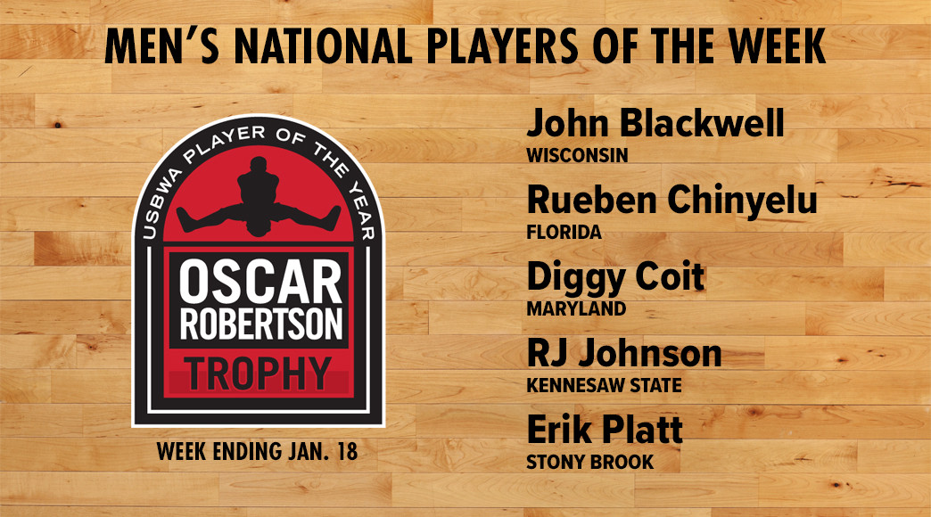 • Week ending Jan. 18: John Blackwell, Wisconsin; Rueben Chinyelu, Florida; Diggy Coit, Maryland; RJ Johnson, Kennesaw State; Erik Platt, Stony Brook.