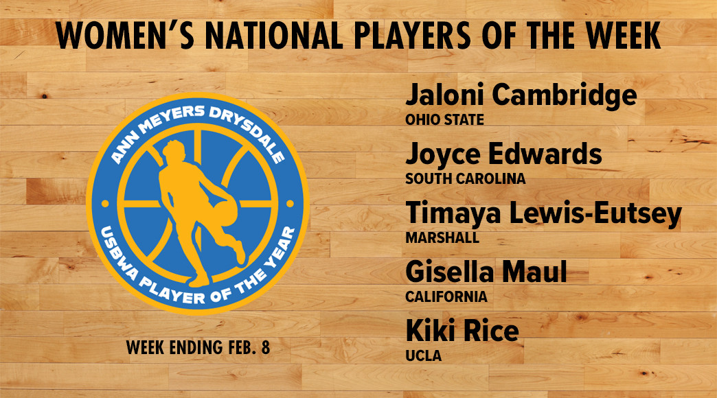 For the period through Sunday, Feb. 8, the five Ann Meyers Drysdale national women’s honorees of the week are Ohio State guard Jaloni Cambridge; South Carolina forward Joyce Edwards; Marshall guard Timaya Lewis-Eutsey; California guard Gisella Maul; and UCLA guard Kiki Rice. The Tamika Catchings Co-National Freshmen of the Week are Kansas forward Jaliya Davis and Siena guard Francesca Schiro, and the National Team of the Week is North Carolina.